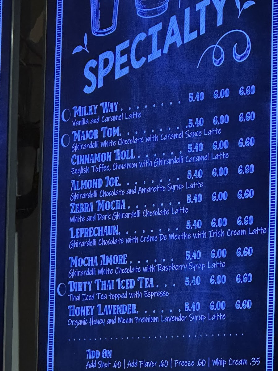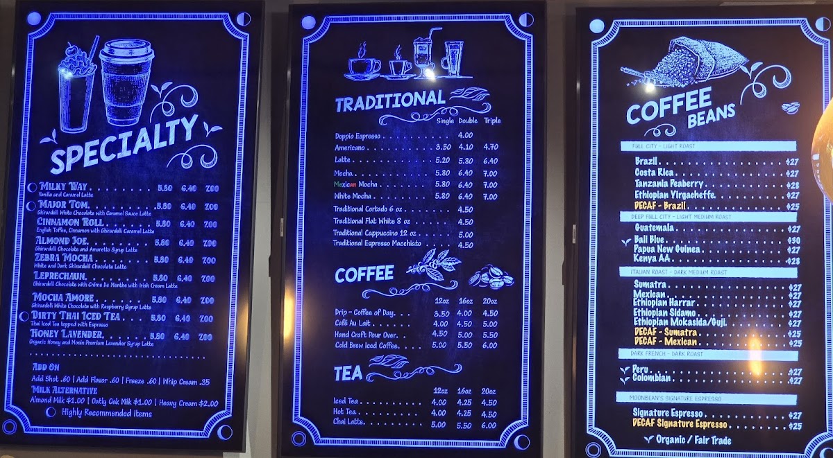 Moonbean's Coffee, located at 6219 Santa Teresa Blvd, San Jose, CA, offers a delightful and diverse menu that caters to a variety of tastes. For those who prefer a refreshing, chilled beverage, their Iced Coffee is a perfect choice, delivering a bold and invigorating flavor. If you enjoy a more traditional coffee experience, their Hot Coffee is an excellent option, rich and full-bodied to start your day right. For fans of creamy, frothy beverages, the Cappuccino is a must-try, with its smooth texture and well-balanced espresso. The Latte Freeze is a unique offering for those who love a cold, blended coffee with a touch of sweetness. And for tea lovers, Tea provides a soothing alternative, with a variety of flavors to choose from. Whether you’re craving something warm, cold, or frothy, Moonbean's menu has something for every coffee and tea enthusiast.